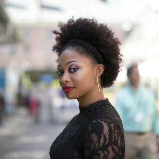 “We’re working with the hair’s natural bends and texture so it doesn’t feel too done,” said Frank. “It’s like you got stuck in the rain — we didn’t want it to look like a blow dry.” To enhance model’s natural texture, Frank and team used Texture Tonic styling spray and gently twisted sections of hair to give it just a touch of wave.