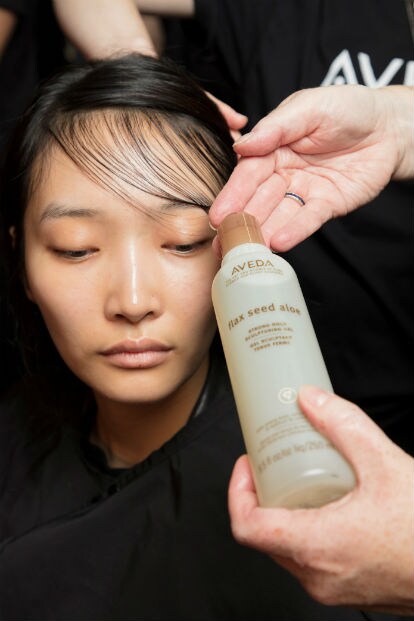 "For this look, apply Aveda favorite, Flax Seed Aloe Strong Hold Sculpting Gel right onto the skin to help the hair stick and shape to the forehead,” says Antoinette.