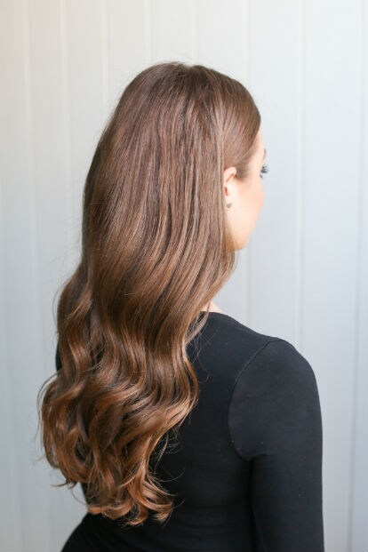 Here, Sarah shares with us one of our favorite looks, a glamorous, head-turning style that is sleek in the front with lush cascading waves in the back.